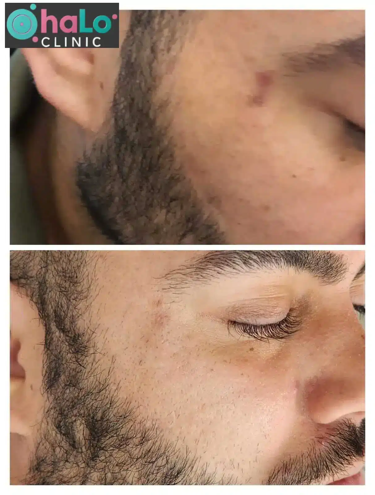 תמונה המציגה תוצאה לפני ואחרי טיפול להסרת נקודות חן מהפנים בלייזר, עם שיפור ניכר במרקם העור ובאסתטיקה הכללית, במסגרת טיפול ב-Halo Clinic.