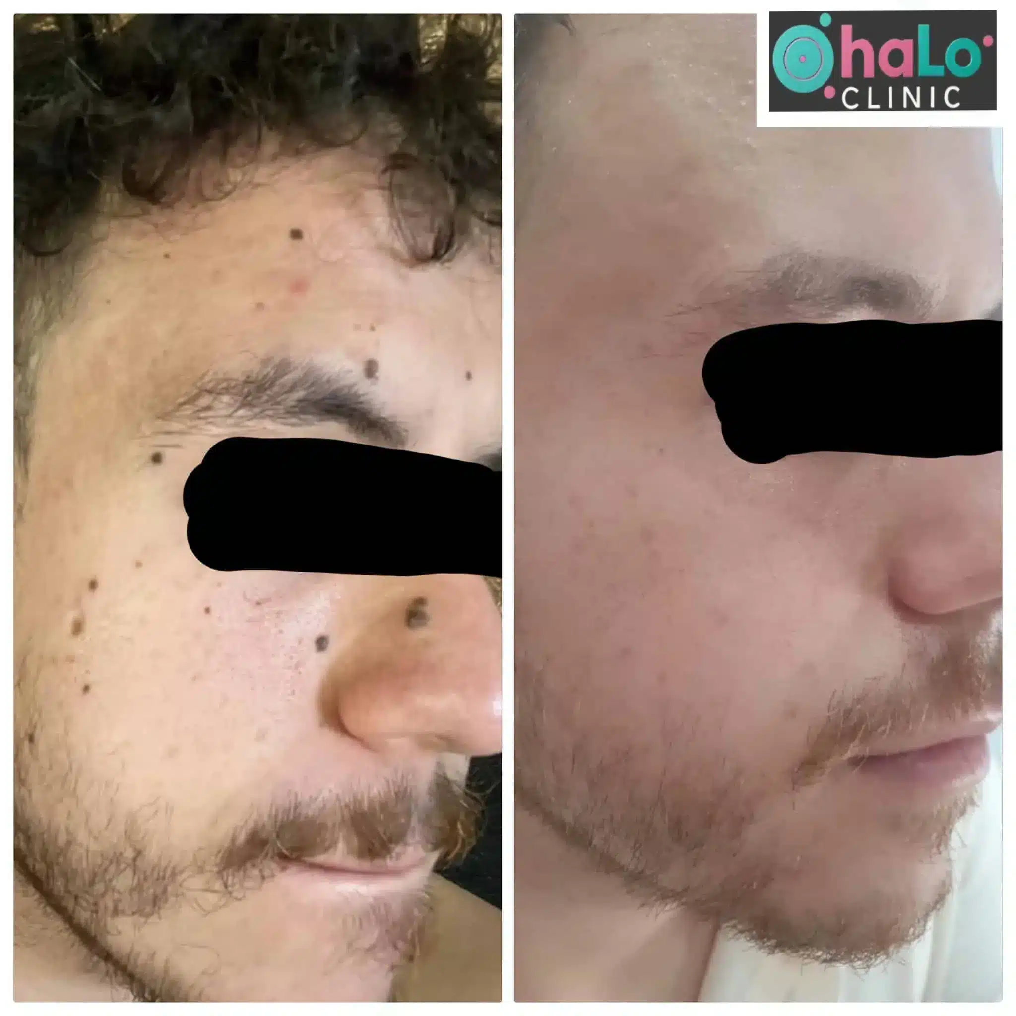 תמונה המציגה תוצאה לפני ואחרי טיפול להסרת נקודות חן מהפנים בלייזר, עם שיפור ניכר במרקם העור ובאסתטיקה הכללית, במסגרת טיפול ב-Halo Clinic.