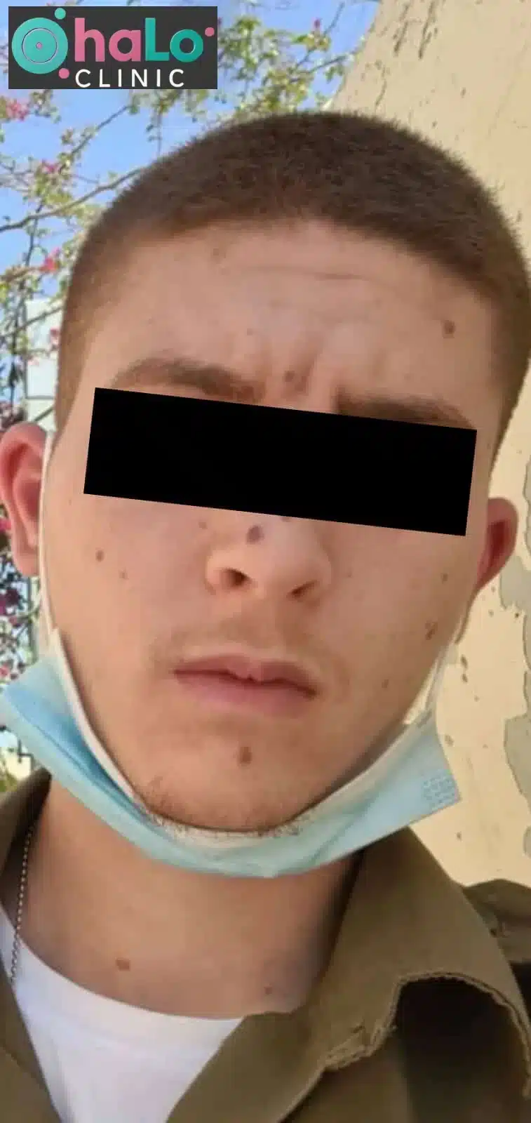 תמונת "לפני" המציגה מטופל צעיר עם נקודות חן בפנים ובצוואר לפני טיפול לייזר להסרה. ב-Halo Clinic מתמחים בהסרת נקודות חן, סרחי עור וקסנטלזמה בלייזר רפואי מתקדם – טיפול בטוח, מהיר וללא צלקות.