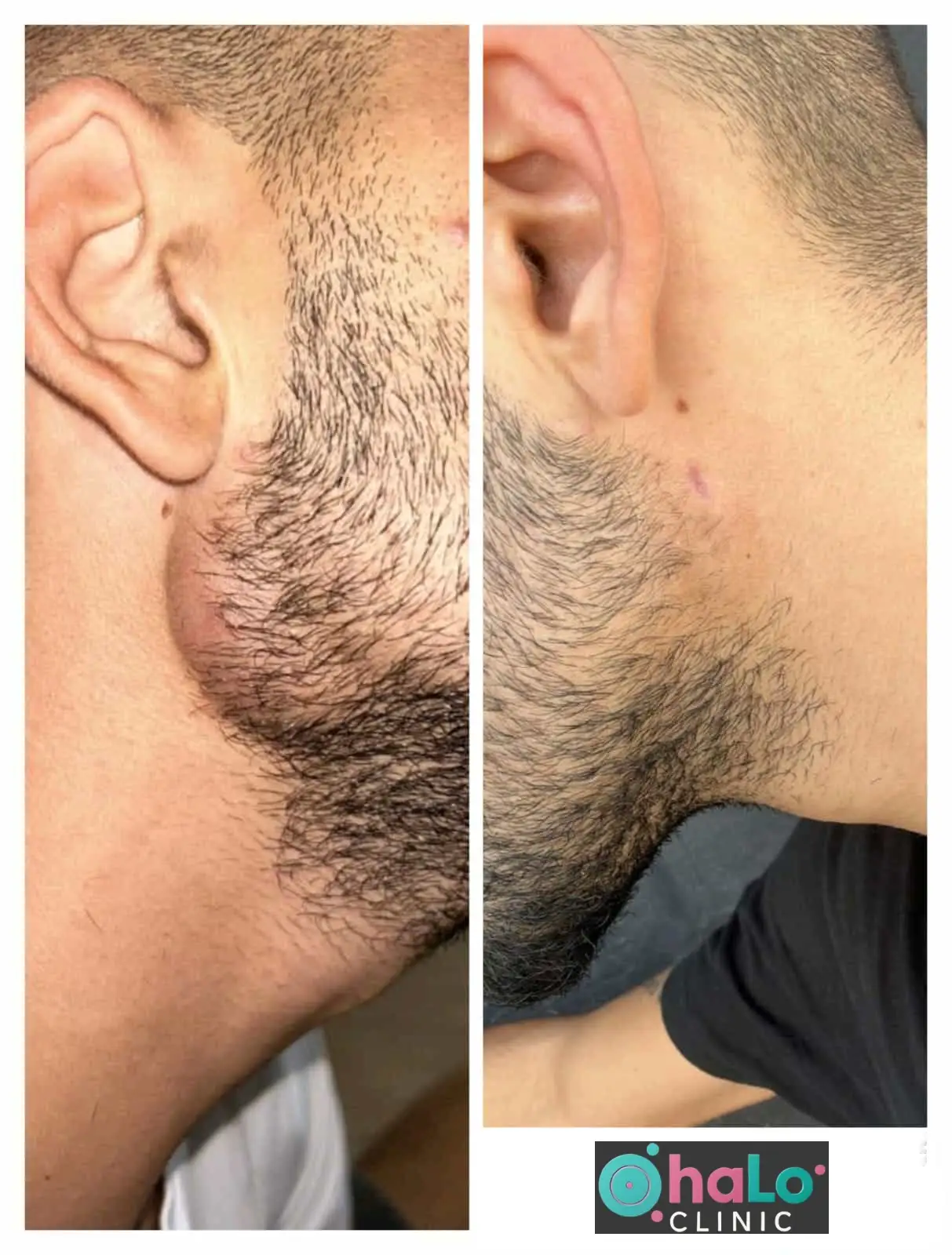 השוואת תוצאות לפני ואחרי טיפול לייזר להסרת נגע עור (ציסטה) בצוואר. ב-Halo Clinic מתבצע טיפול מהיר, מדויק וללא צלקות, עם תוצאה אסתטית טבעית.