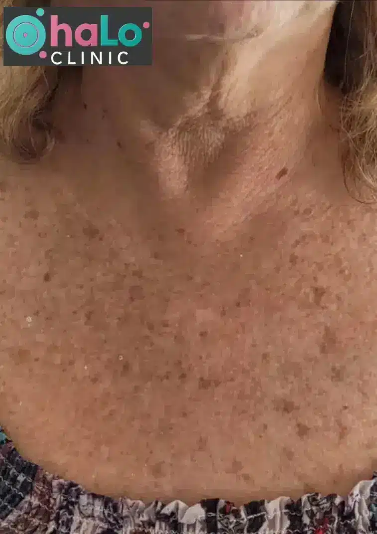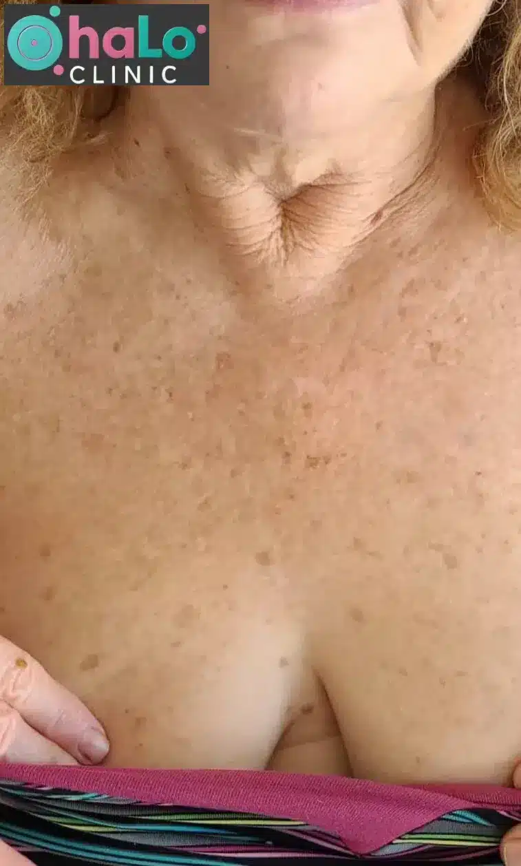 תמונה מסדרת לפני/אחרי באתר Halo Clinic המציגה כתמי עור ופיגמנטציה באזור החזה לפני טיפול לייזר. הקליניקה מתמחה בהסרת נגעי עור, נקודות חן, סרחי עור וקסנטלזמה תוך מתן פתרונות אסתטיים מתקדמים.