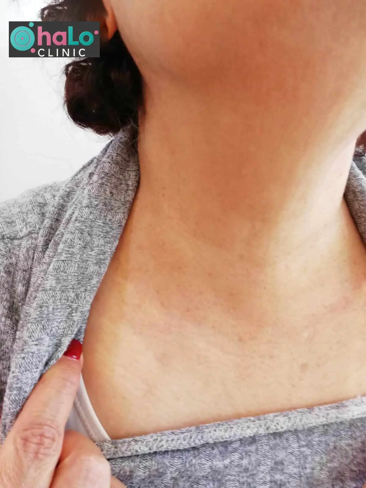 תמונת "אחרי" המציגה את צוואר המטופלת לאחר טיפול לייזר להסרת סרחי עור. ב-Halo Clinic מבוצעים טיפולים בטוחים, מדויקים ואסתטיים להסרת נגעי עור כגון סרחי עור, נקודות חן וקסנטלזמה, עם תוצאות טבעיות וללא צלקות.